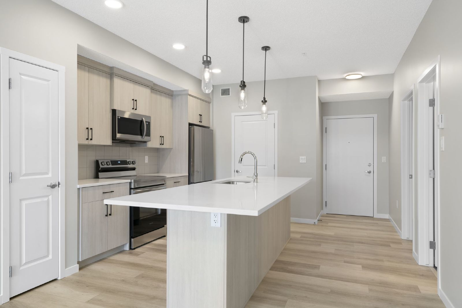 The thoughtfully designed split-bedroom floor plan provides excellent privacy. The primary suite includes a walk-in ensuite, while the spacious second bedroom is well suited for guests or a home office. In-suite laundry room for everyday convenience.