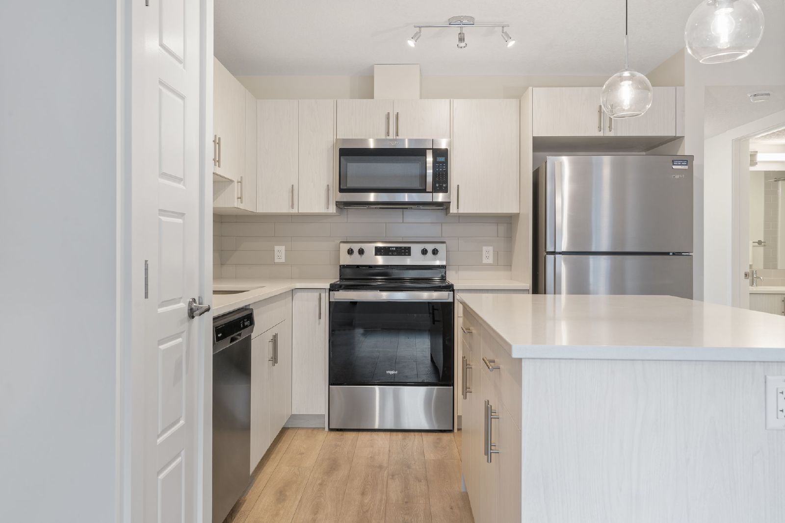 The open-concept layout features a bright living area with large windows, seamlessly flowing into the kitchen and dining space—ideal for everyday living and entertaining. Both bedrooms are generously sized, offering ample closet space and natural light. The modern bathroom is thoughtfully designed with quality finishes.